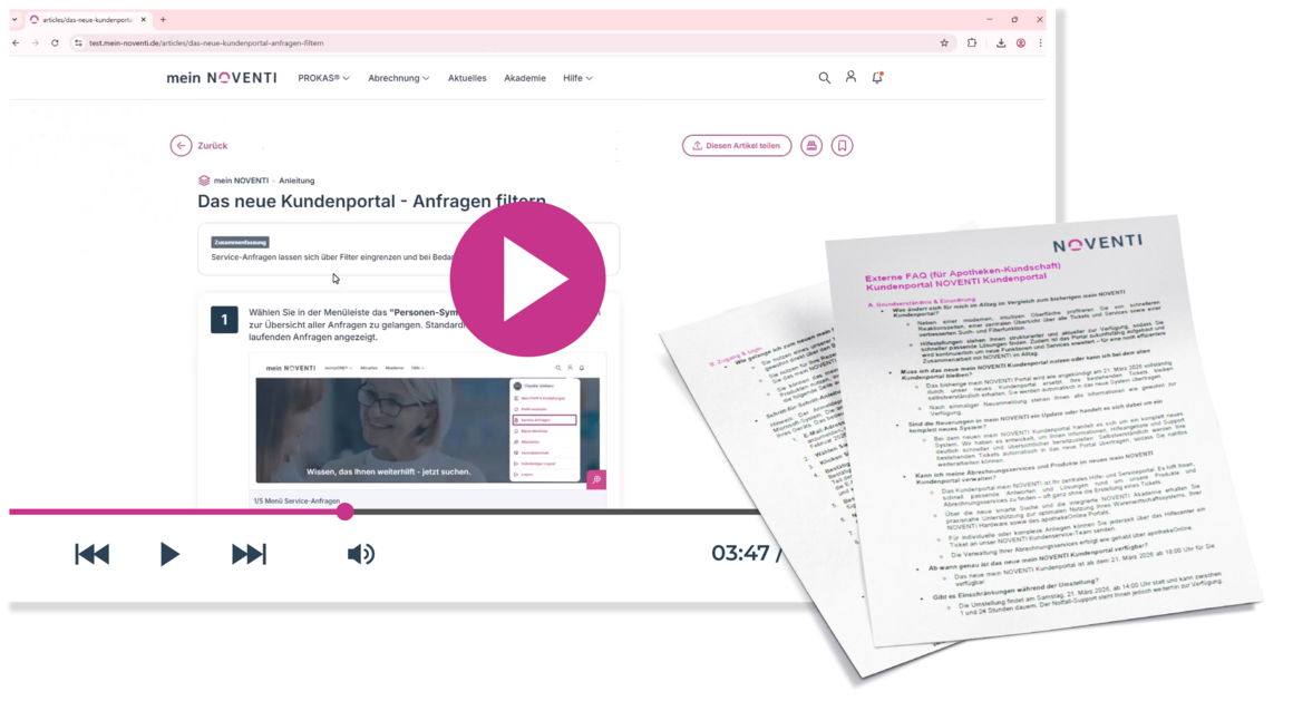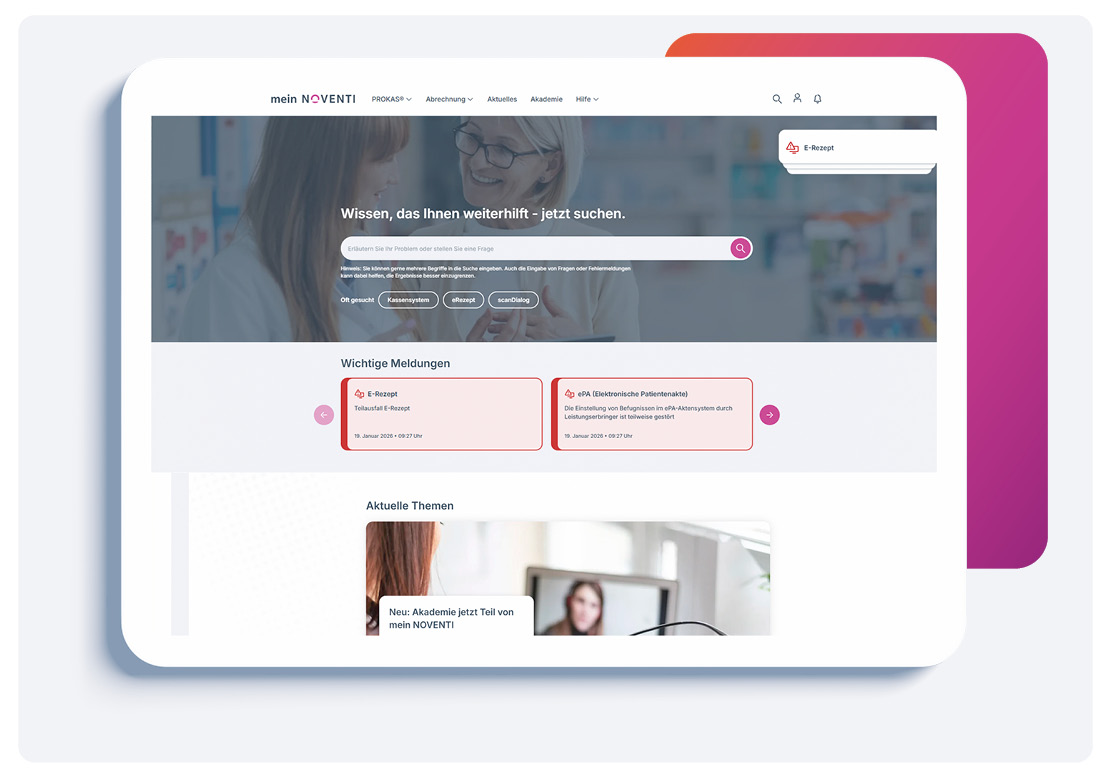 Auf mein NOVENTI finden Sie alle Informationen, Services und Unterstützung für Ihren Apothekenalltag an einem Ort. Routinefragen lassen sich direkt im Portal klären und wenn es komplizierter wird, sind wir persönlich für Sie da – damit Sie sich auf das Wesentliche konzentrieren können: Ihre Patientinnen und Patienten.